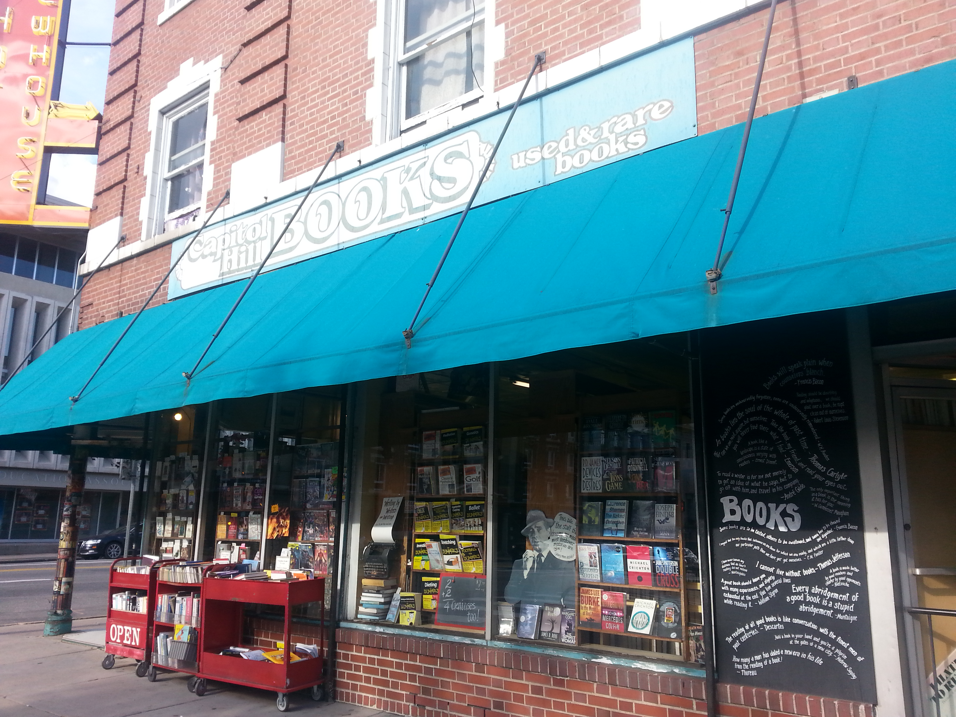 While wandering around and taking pictures in Denver of the gold-domed state capital, the spires of the Cathedral Basilica of the Immaculate Conception, and the Molly Brown House, I stopped in Capital Hill books. A small but bright and orderly used book store, it has various notes and communications around the store that give it a cheerful personality.