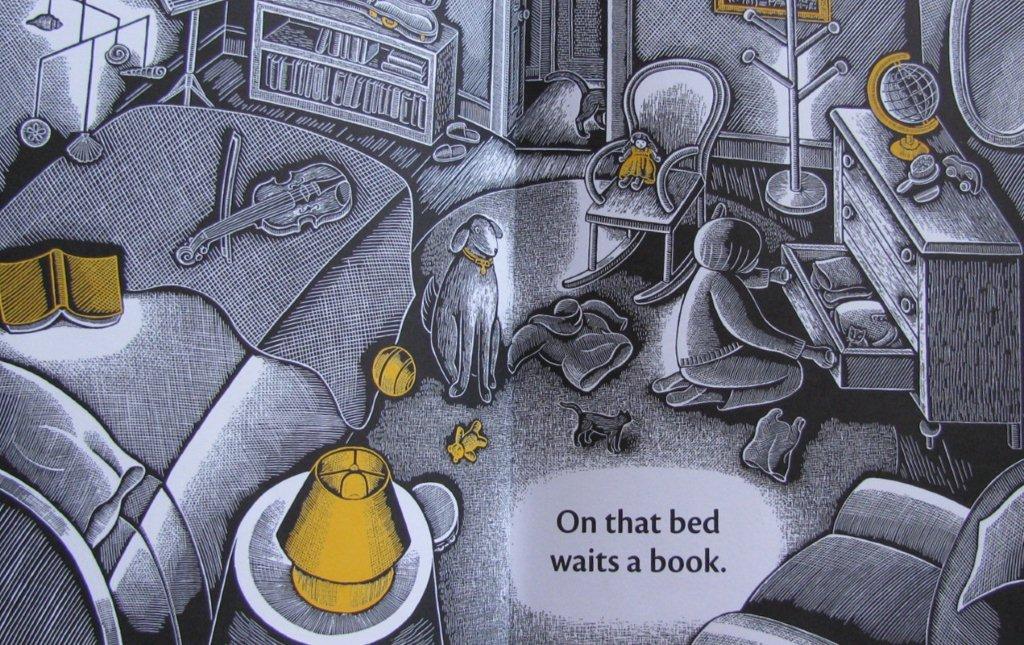 There is something gentle, rhythmical, predictable and comforting about poems with cumulative patterns. This book takes us through a dark but friendly and peaceful journey out the window, all around and back again. I was in awe when I read that all the intricate drawings were done on scratchboard. According to the author’s fascinating note at the end, the inspiration for this book came from a 1955 nursery rhyme book.