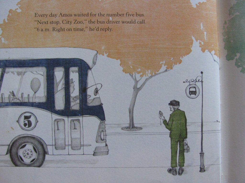 The whimsical drawings in this book set the tone, and they pleasantly remind me of many of the books I read as a child in the 1960’s. With one look at his ever-present grin, we are drawn into Amos’s simple daily life as he cares for animals of all personalities who have needs we wouldn’t have noticed unless we were as observant and considerate as he is.